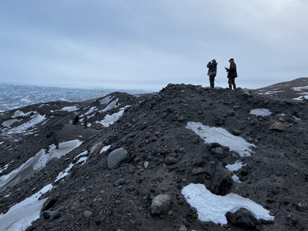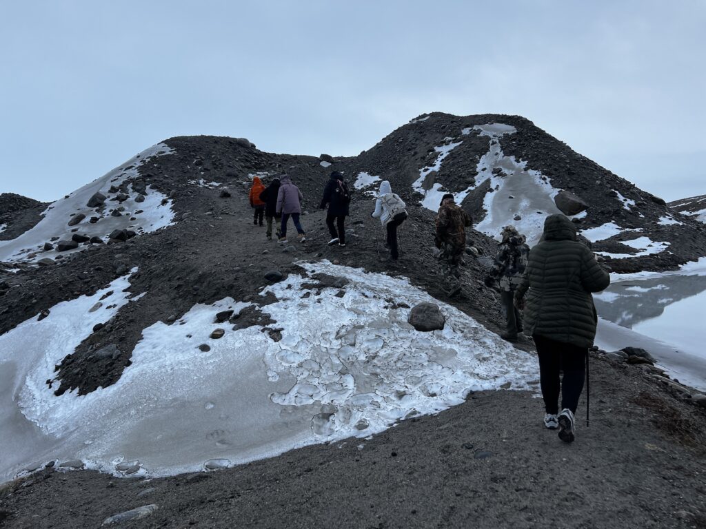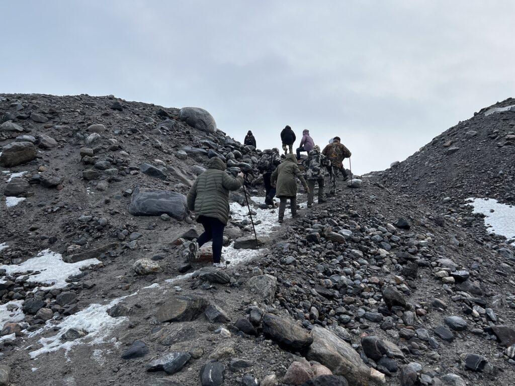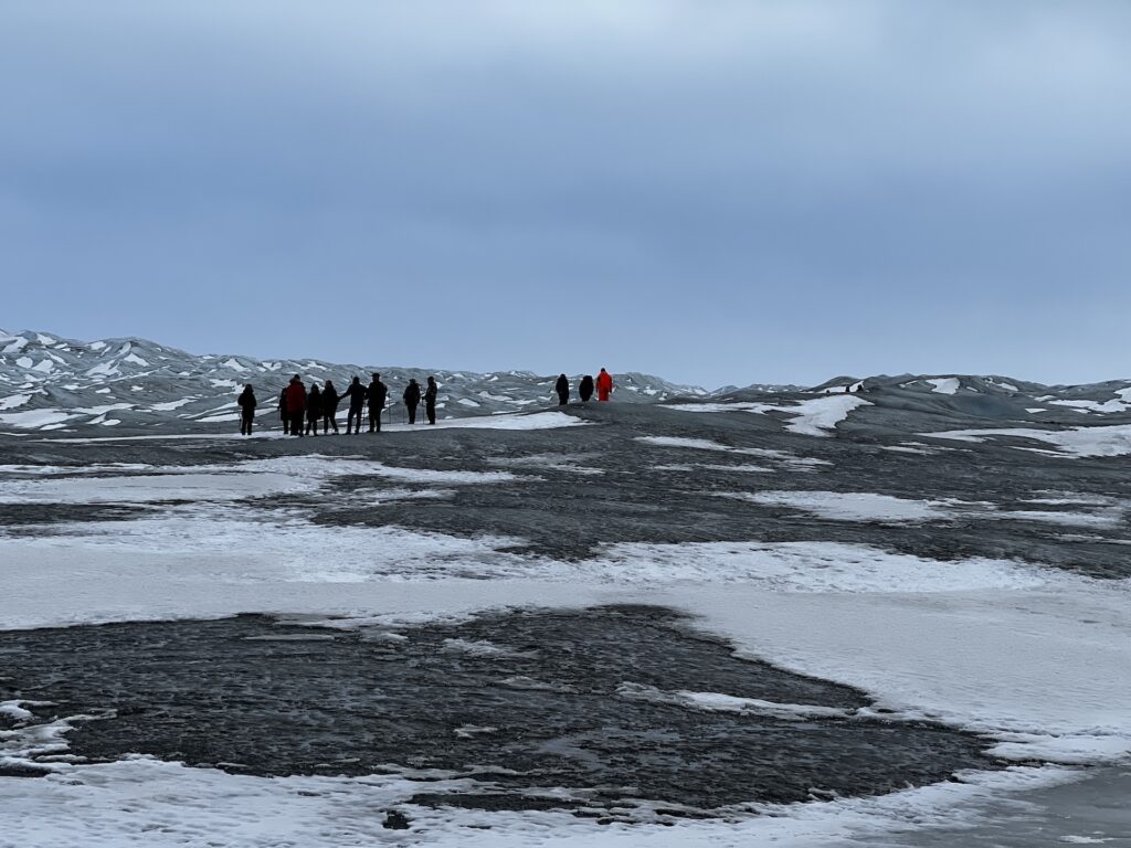 And now to the Greenland Ice Sheet (Arctic Cap). Before arriving, the guide explained that sometimes conditions were questionable, sometimes it was too slushy to walk on the ice cap, sometimes too slippery, etc. And it wasn’t a straight walk to the ice sheet. It was up and down steep hills and inclines, slippery due to snow/slush and slippery as the path was covered with smooth rocks and fine pebbles.