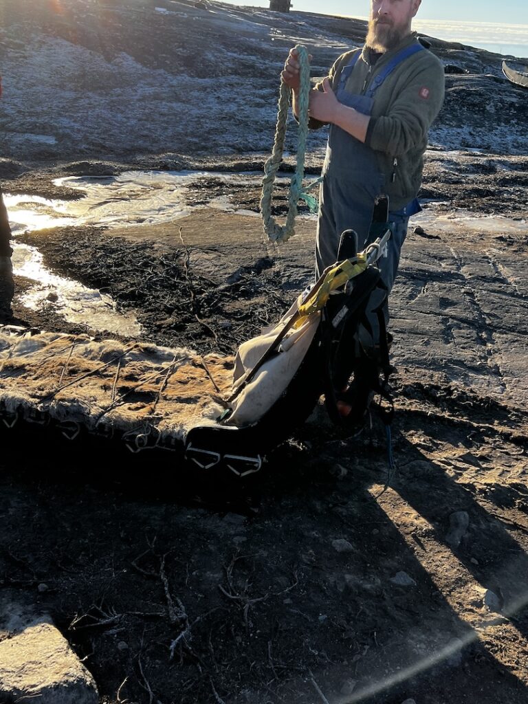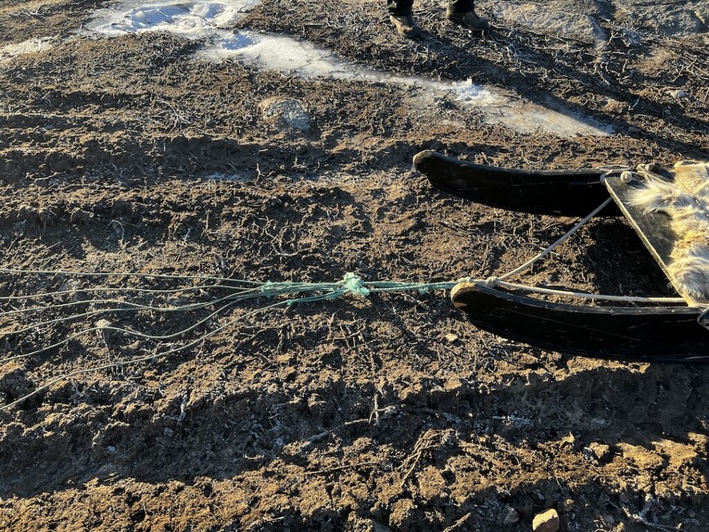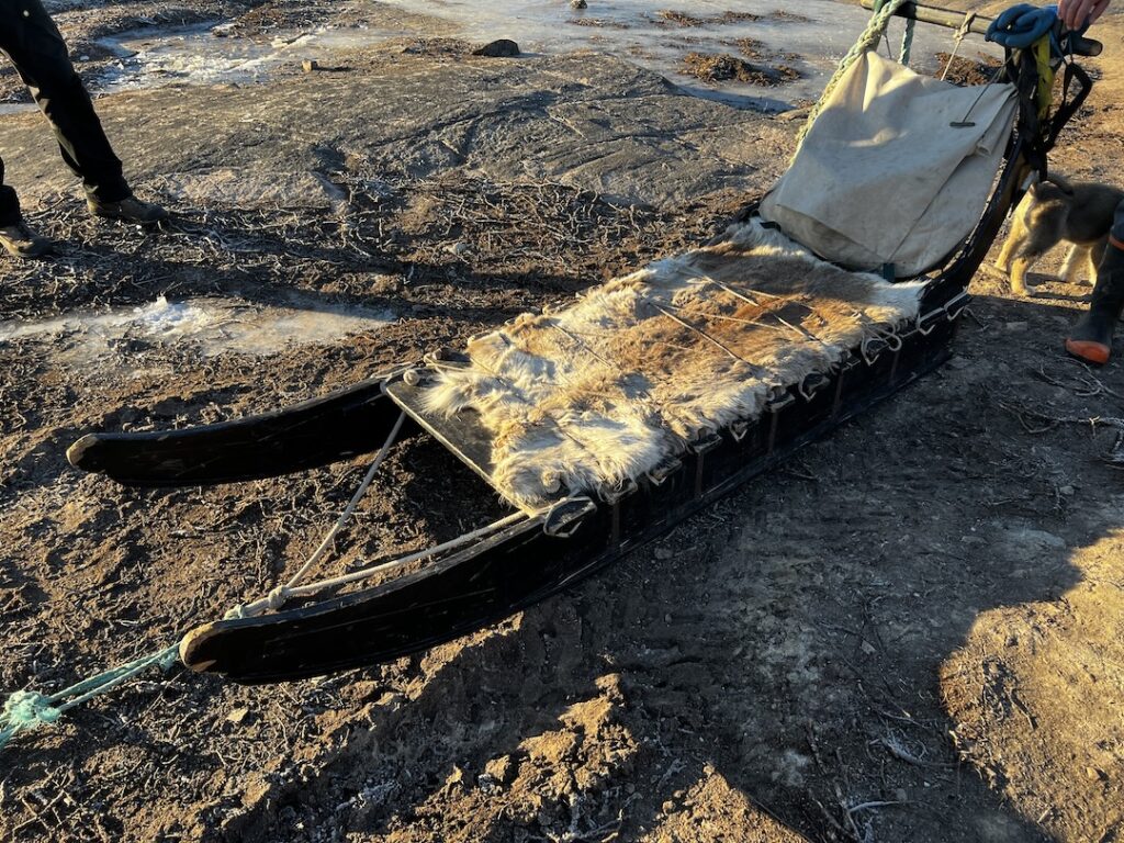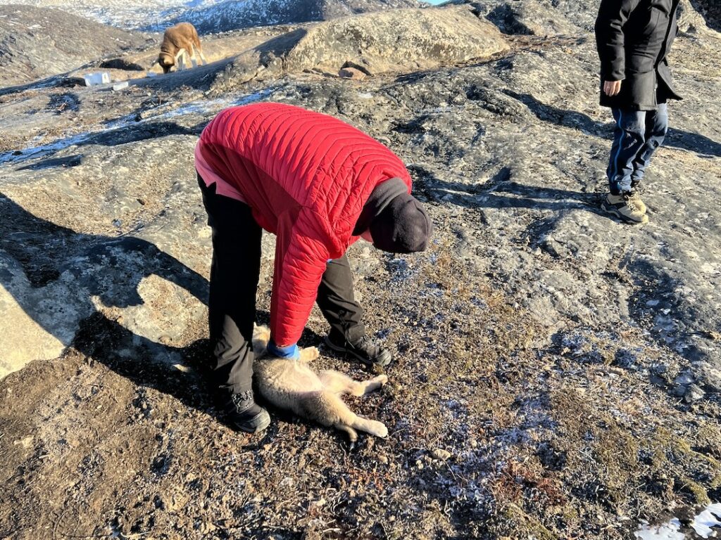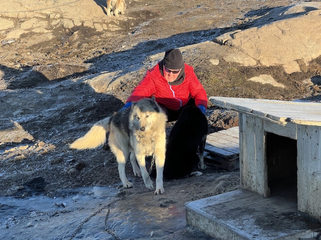 During off-season, when the dogs are not pulling sleds, he allows tours to stop by and provide socialization with/for the dogs. Before meeting the dogs, he explained how Greenlandic sleds work as they aren’t the same as those used in Alaska (where they are on a single line, with pairs situated down the line). Rather than have all dogs on one harness, each GSD is on a separate lead allowing them to “fan out”. The sleds are made from plywood, and the parts are bound together with seal leather rather than nails. The leather strapping has give, allowing the sled to flex when traveling over rugged landscapes whereas nails would allow no give and a sled would quickly fall apart.