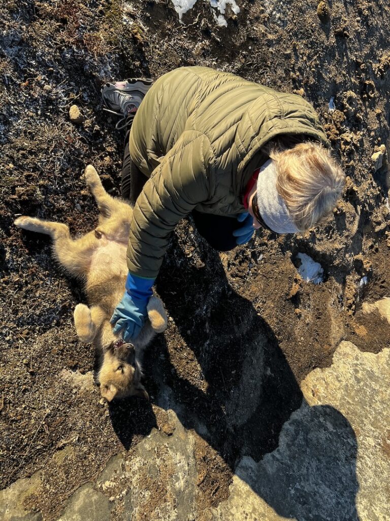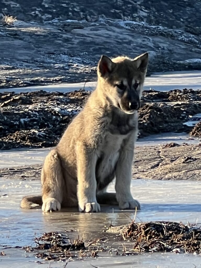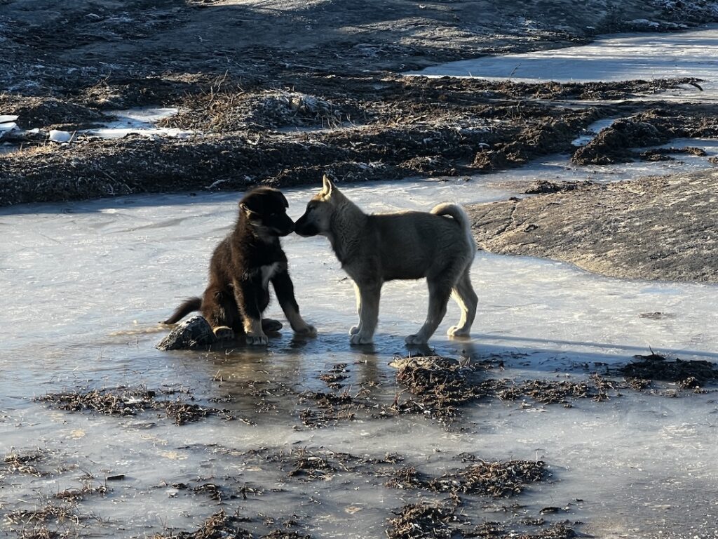And now, onto the dogs!!! The first dogs we met were some pups that were 10-12 weeks old. They were adorable, a bit mischievous and curious, and allowed to roam. This is an example of how hearty these dogs are – ice does not affect them.