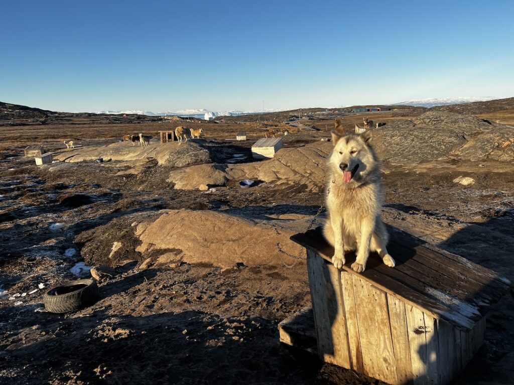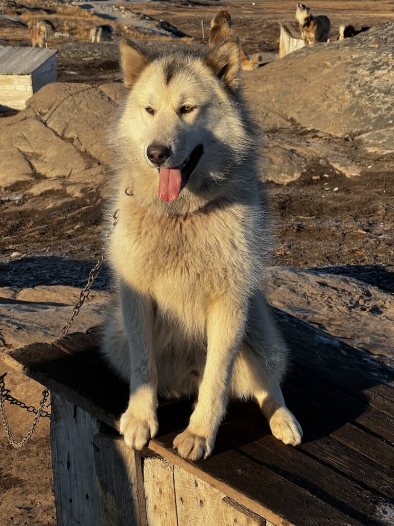 We had the opportunity to visit a sled dog camp!! Before going on, let us give some background on Greenlandic Sled Dogs else you’re going to feel sad and/or appalled at their living arrangements. Greenlandic Sled Dogs (GSDs) are one of the oldest breeds in the world, having been traced back 10,000 years. To keep the line pure the only other dog allowed north of the Arctic Circle are police dogs. So, they are not pets, they have a job to do, and they are bred to survive subzero temps. They live outside, sleeping on pallets or rocks or doghouses, and are chained apart from each other. This keeps them from killing one another as they fight for dominance to determine who is the alpha of the pack and subsequent hierarchy.