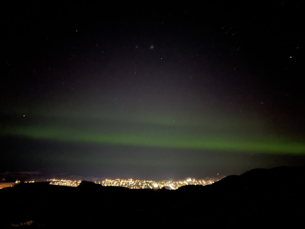 And yet another story to tell tonight! We were in our room working on this blog and someone knocked on the door around 10:05 pm. We immediately knew it was our new friend alerting us that the lights were out. As we had expected them much later, we didn’t have our wool long johns or gaiters/scarves on, and it was windy and miserable. The lights were different than two night ago as they were settled over the city – no obvious movement and never increasing in intensity. We stayed out as long as we could taking pics but had to give into the elements as the lights faded. The plan is to continue to monitor from our hotel room, and our woolens are laid out in case we have another knock on the door! Here are a couple of shots.