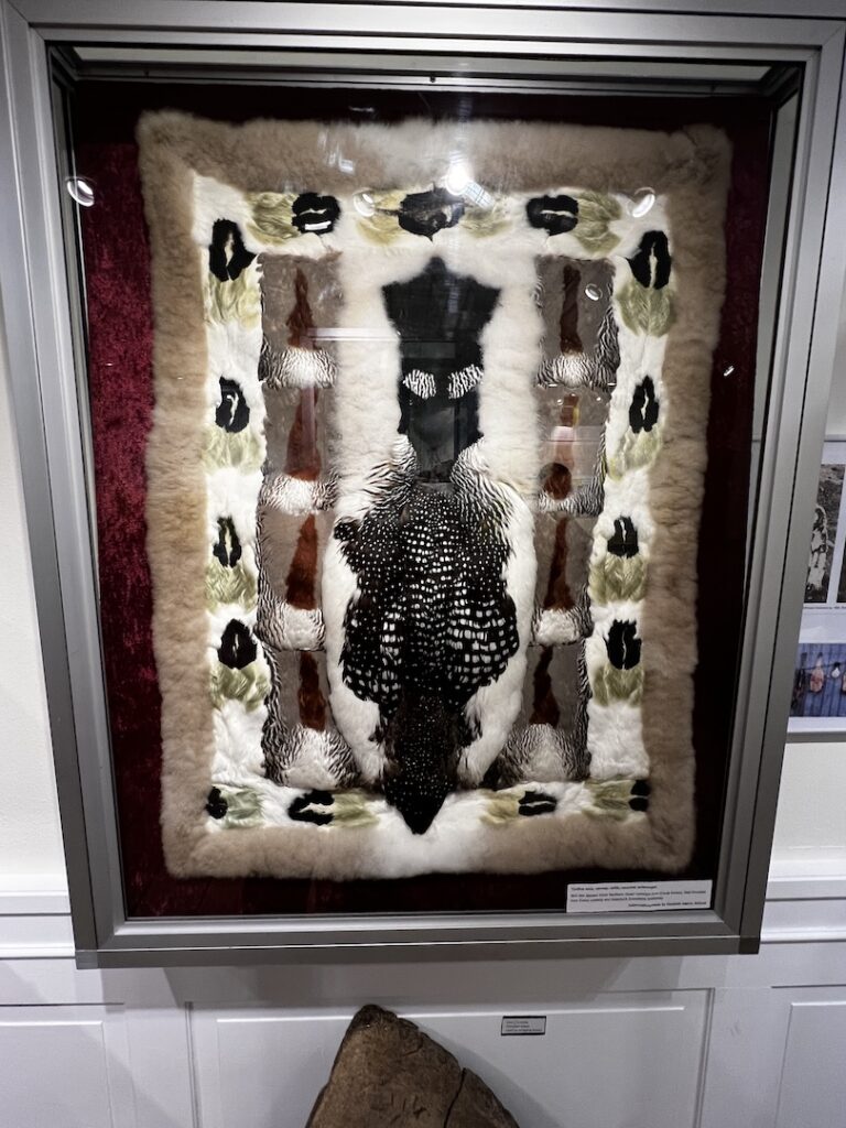 This museum also prohibited shoes and had seal skin slippers to wear. There is a lot packed into this museum! Traditional clothing displays including outfits with intricate beaded wristlets and collars, a pair of sealskin boots that must be considered thigh highs as they were way above normal knee level, and many other articles of clothing. There were many pictures, notes, and general information, as well as a dog sled display, a kayak display, a video area, etc. Here is a broad sampling of pictures: